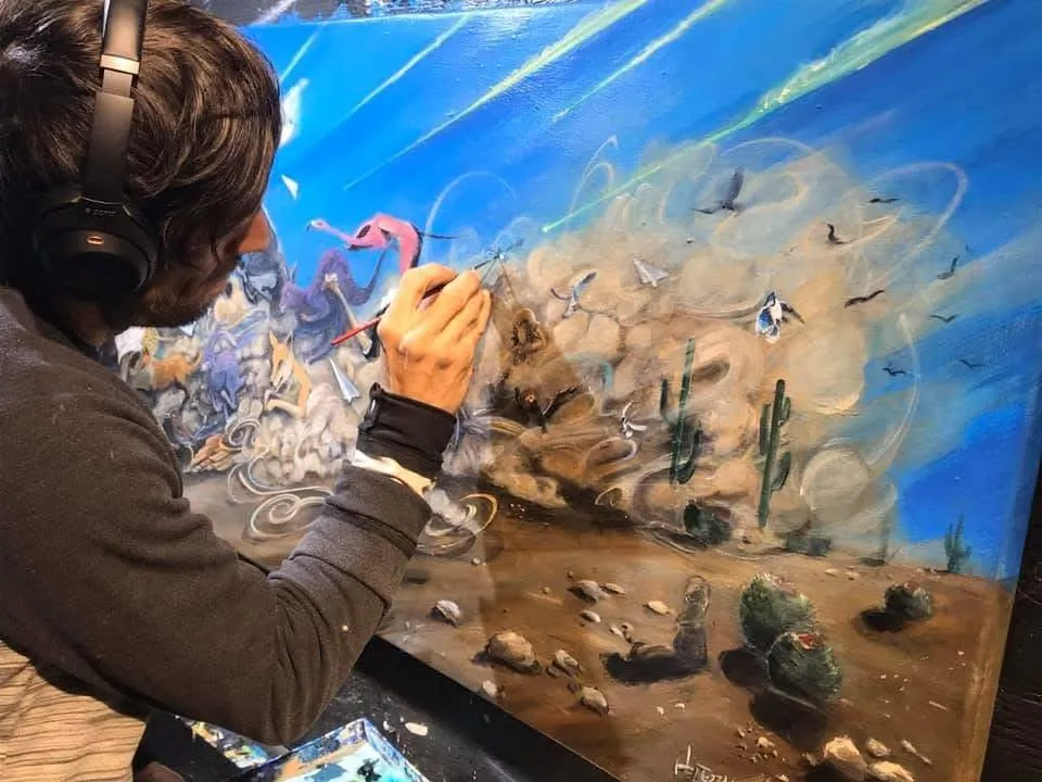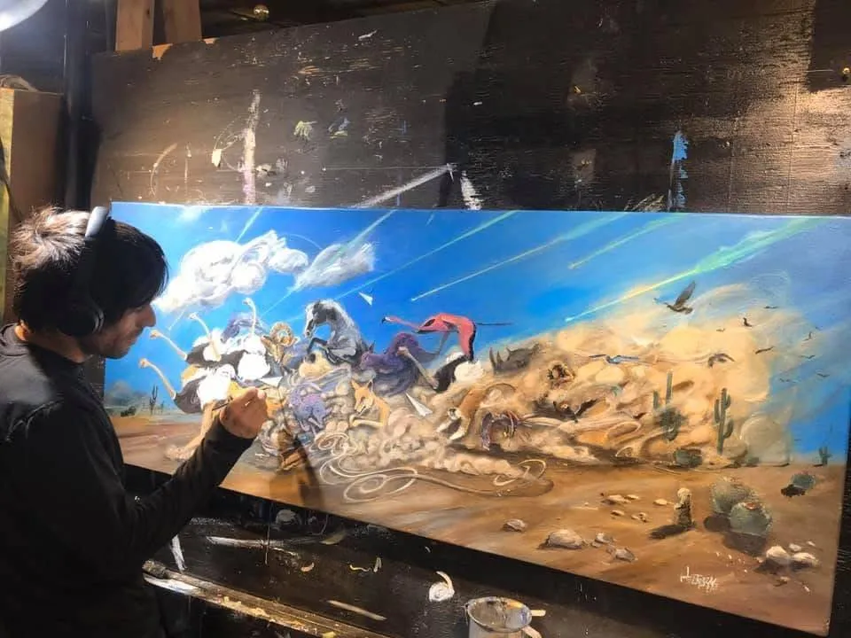 This piece originally began as a vision of an ostrich stampede, but as I continued painting—starting live at an event and later refining it in the studio—it naturally evolved into something much wilder and more spontaneous. What started with one idea turned into a full-on free-for-all, featuring a variety of animals and even a female farmer caught up in the chaos. It became less about control and more about the energy of unpredictability, movement, and playful disorder.